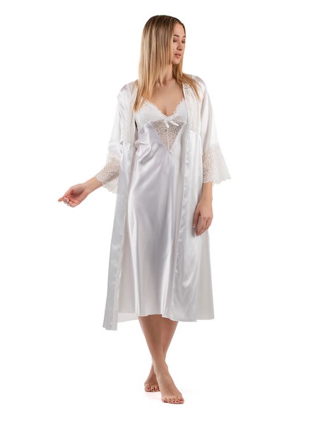 Γυναικεία νυφική ρόμπα με νυχτικό σε λευκό χρώμα της εταιρίας Secret Point. Ελαφρυά και αέρινη, ιδανική για τους καλοκαιρινούς μήνες. Με σατινέ ύφανση που προσδίδει γυαλάδα και απαλή υφή.